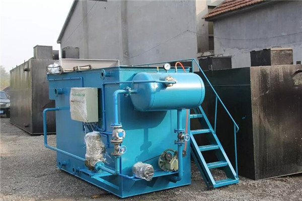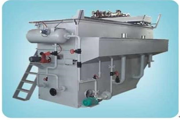 2.預處理后的污水進入氣浮裝置,在進水室污水和氣水混合物中釋放的小氣泡(氣泡直徑范圍為30~50um)混合。這些小氣泡粘附在污水中的絮凝劑上,形成比例小于水的浮體。浮體上升至水面,凝結成浮油(或浮渣),通過刮油(渣)機刮至油(渣)槽;
