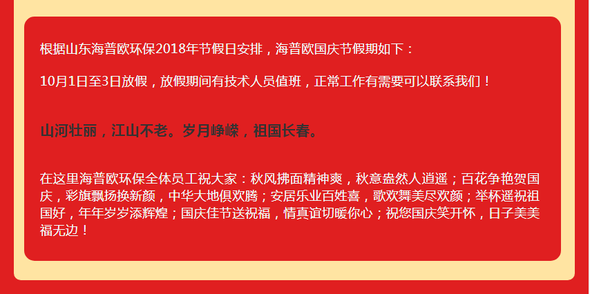 山東海普歐環保設備科技有限公司祝祖國山河壯麗,江山不老。歲月崢嶸,祖國長春。