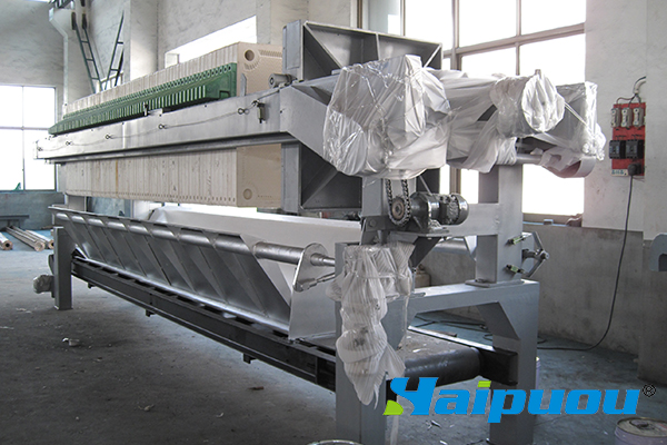 工作原理:在密閉的狀態下,經過高壓泵打入的污泥經過板框的擠壓,使污泥內的水通過濾布排出,達到脫水目的。