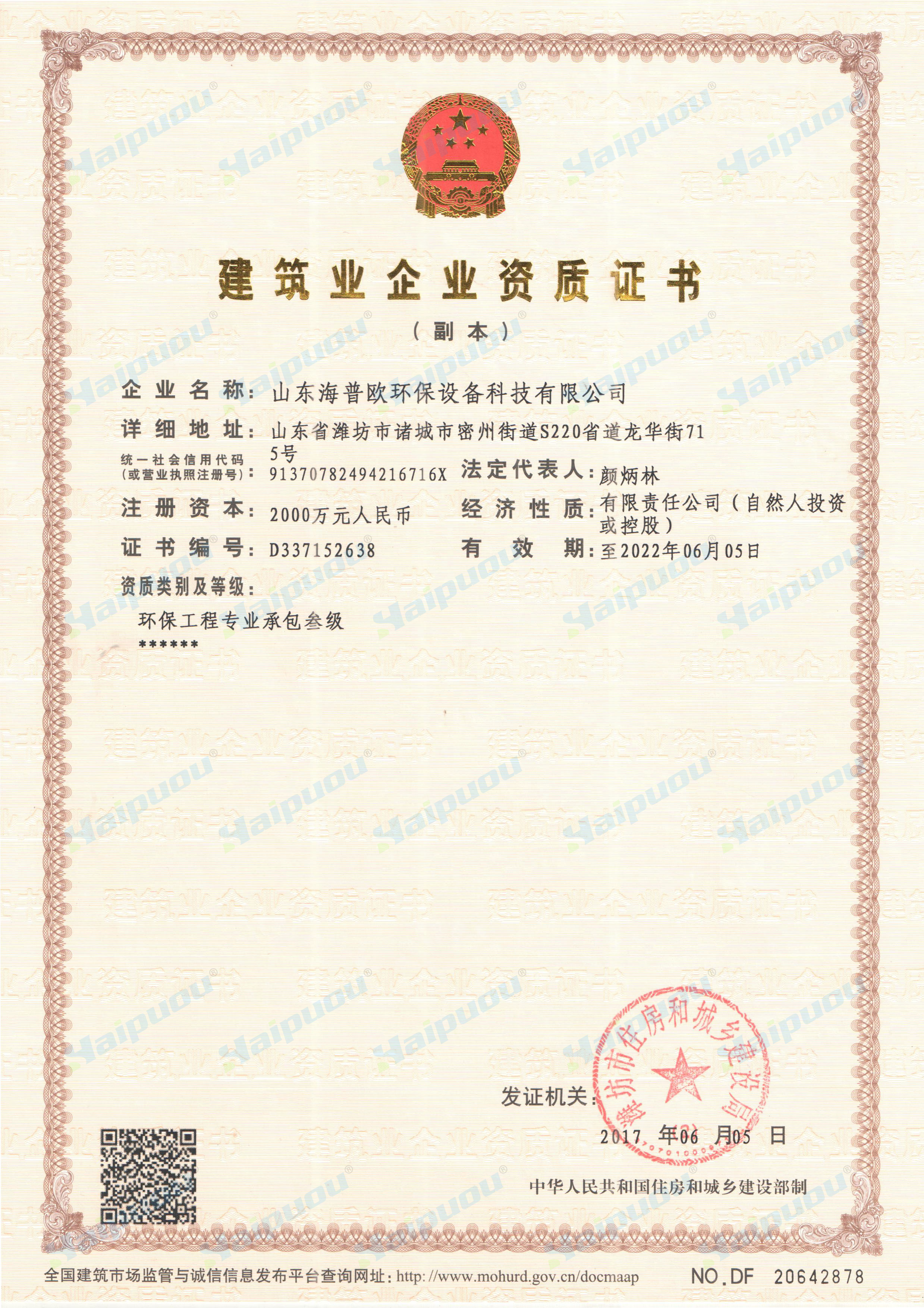 近日,山東海普歐環保根據相關部門要求重新審核重置了“環保工程專業承包三級資質”發證日期,此項資質的增項是近一步完善公司資質體系的良好開端。山東海普歐高度重視資質建設工作,建立了由公司領導牽頭,職能部門負責,相關部門配合,全員共同參與的資質申報工作機制。在2017年公司的資質建設工作規劃中,還將完成7個資質增項,進一步海普歐環保的資質覆蓋面,增強總承包資質的配套性,為山東海普歐拓展發展空間和潛力增添敲門磚。
