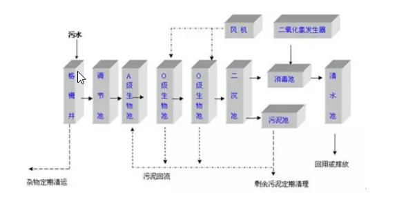 A2/O工藝是Anaerobic-Anoxic-Oxic的英文縮寫,是厭氧-缺氧-好氧生物脫氮除磷工藝的簡稱。這種工藝處理效率一般能達到:BOD5和SS為90%~95%,總氮為70%以上,磷為90%左右,一般適用于要求脫氮除磷的大中型城市污水廠。